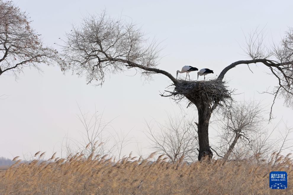 3月27日,一对东方白鹳在黑龙江挠力河国家级自然保护区的千鸟湖湿地筑巢繁育。