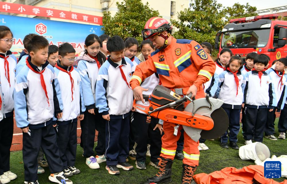 3月28日,在山东省枣庄市台儿庄区实验小学,消防救援队员为学生们介绍消防器材功能。