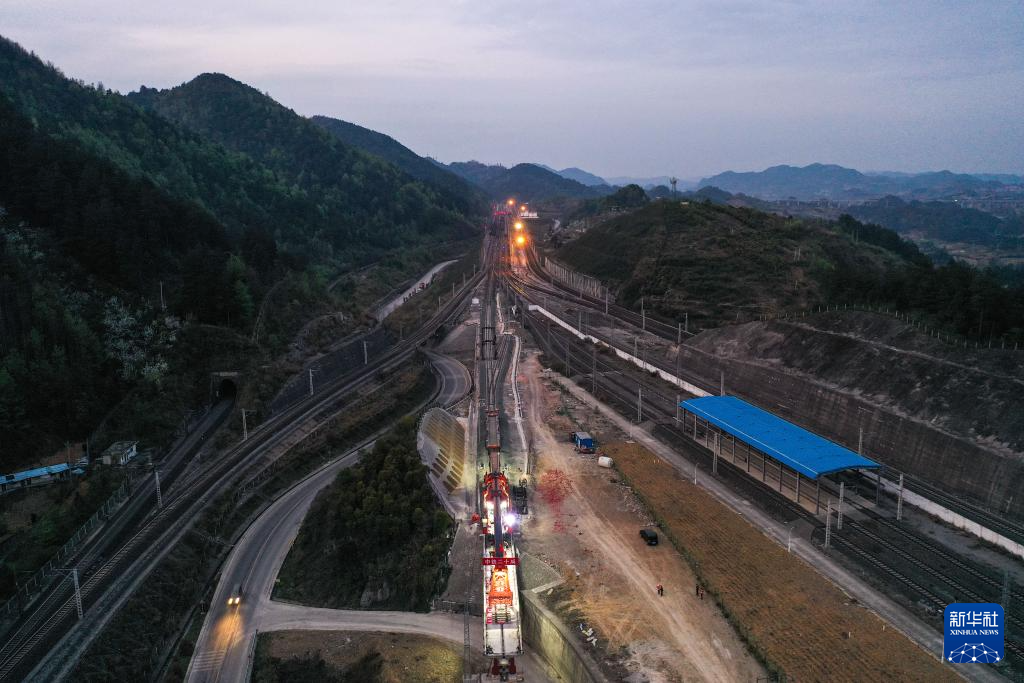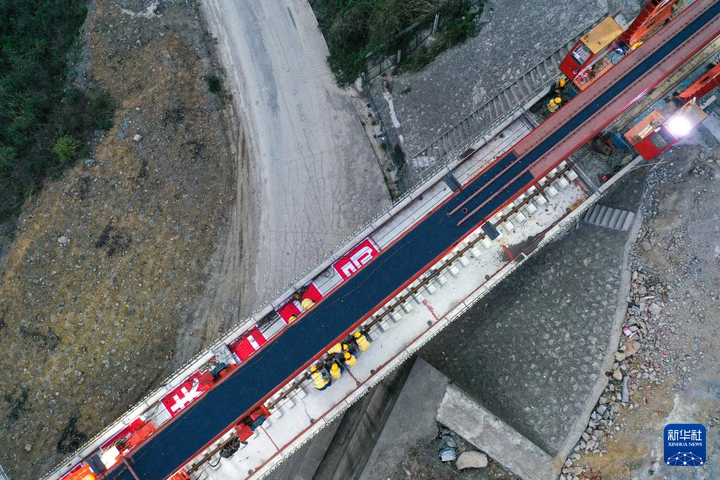 这是3月31日拍摄的贵州瓮马铁路南北延伸线姜家坪大桥轨道铺设现场(无人机照片)。