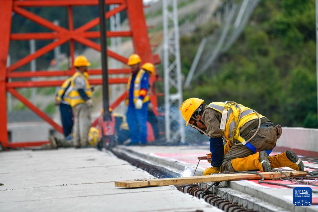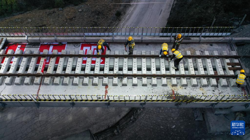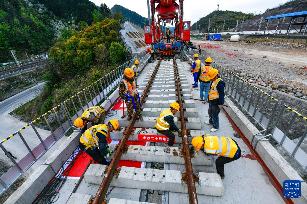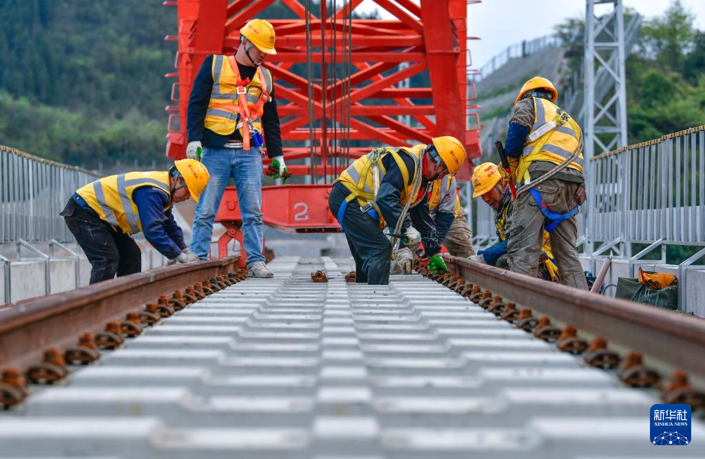 3月31日,工人在贵州瓮马铁路南北延伸线姜家坪大桥上铺设轨道。