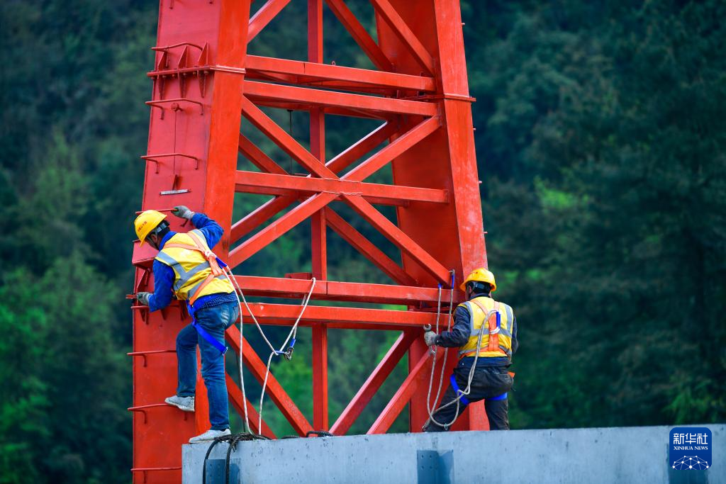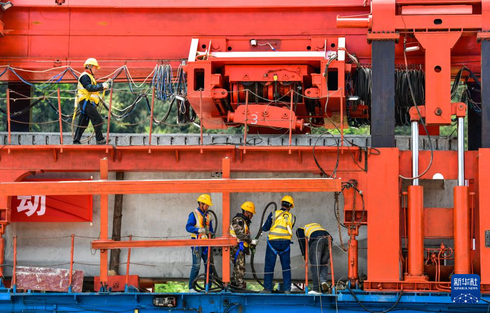 3月31日,工人在贵州瓮马铁路南北延伸线姜家坪大桥上架设T梁。