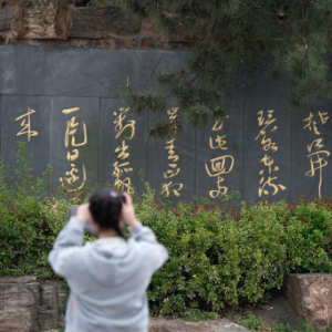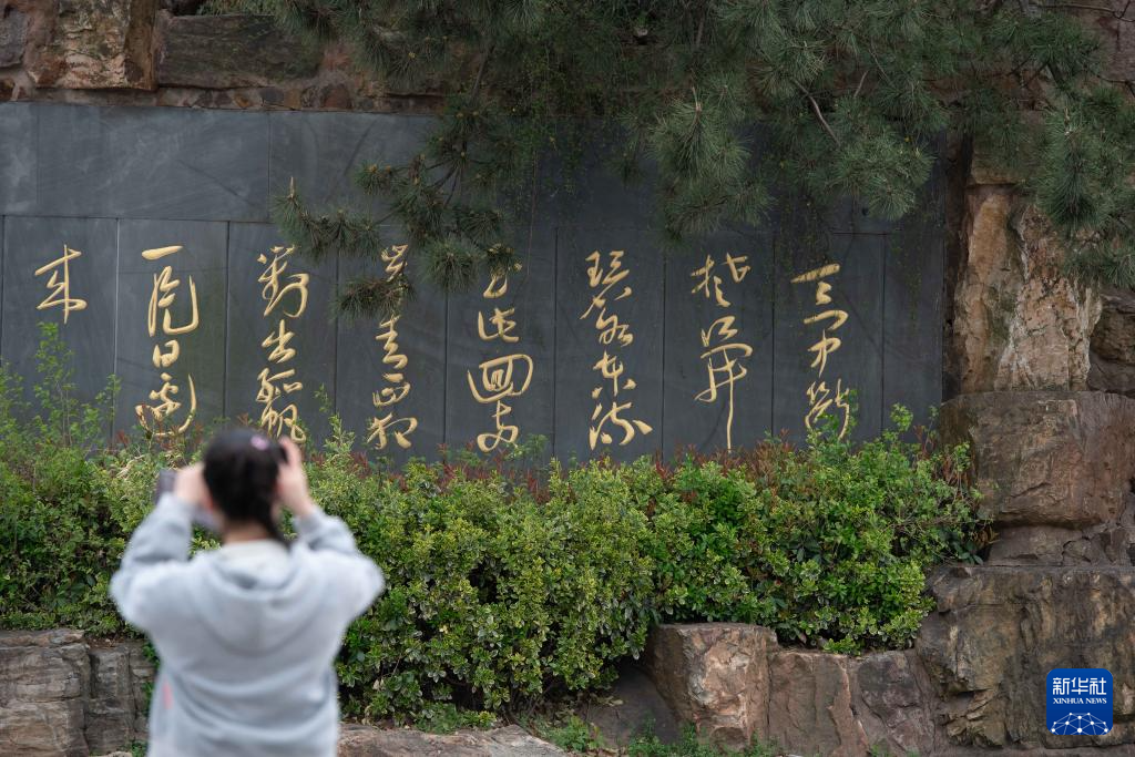 3月28日,游客在敬亭山国家森林公园内游玩,画面右方为李白雕像。敬亭山位于安徽省宣城市,也被誉为“江南诗山”,李白在此留下诗作《独坐敬亭山》。