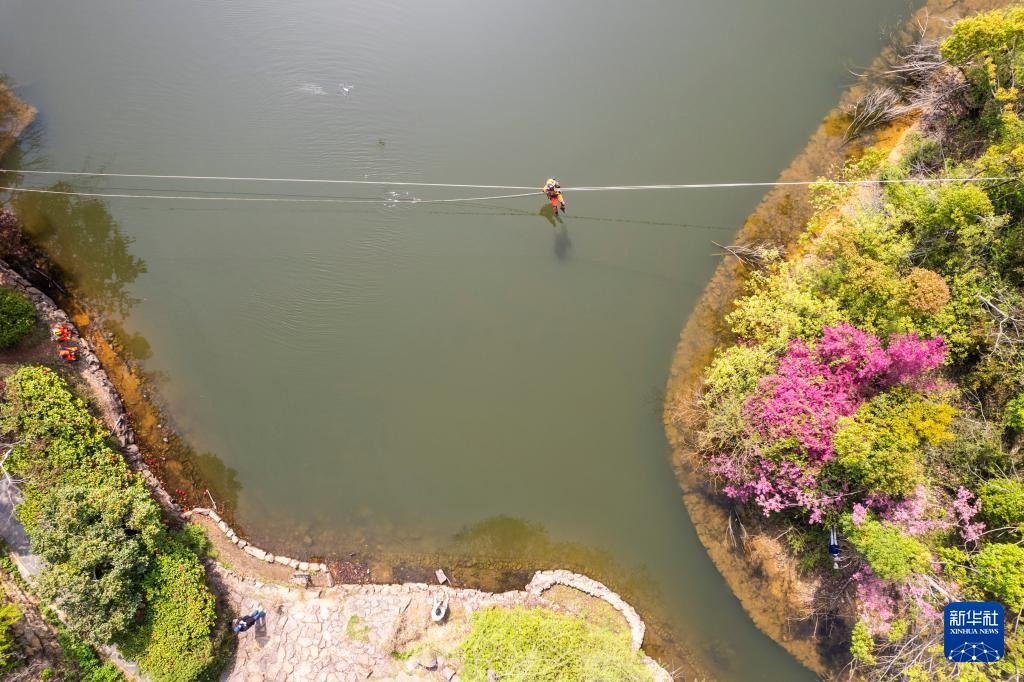 4月1日,在长沙岳麓山穿石坡湖附近,消防救援人员在进行孤岛救援演练。