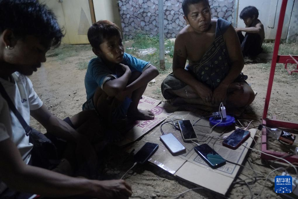 3月31日,在缅甸首都内比都,地震受灾民众围坐在地上给手机充电。