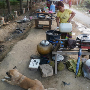 3月31日,在缅甸首都内比都,一名女子在土路边做晚饭。
