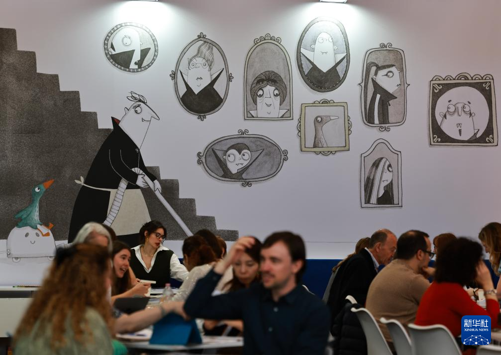 3月31日,在意大利博洛尼亚,参展商在第62届博洛尼亚童书展上洽谈。