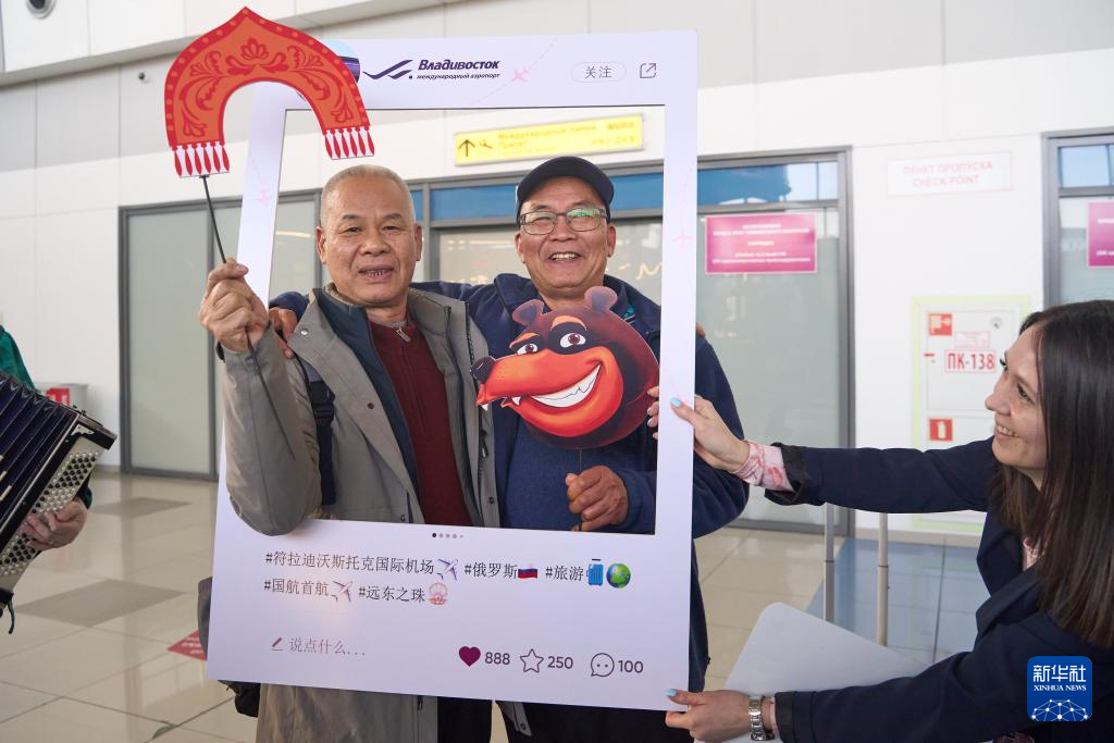 3月31日,北京-符拉迪沃斯托克航线首航班机乘客在俄罗斯符拉迪沃斯托克国际机场合影。
