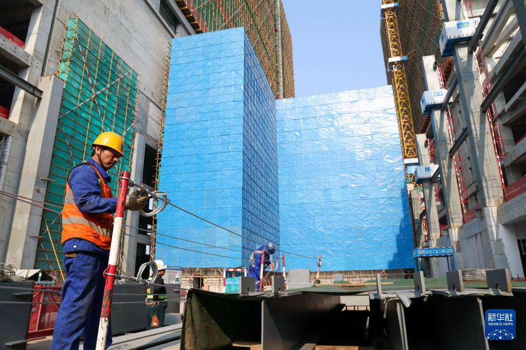 4月1日,工人在哈工大(深圳)重点实验室集群项目的结构静力大厅反力墙前施工。