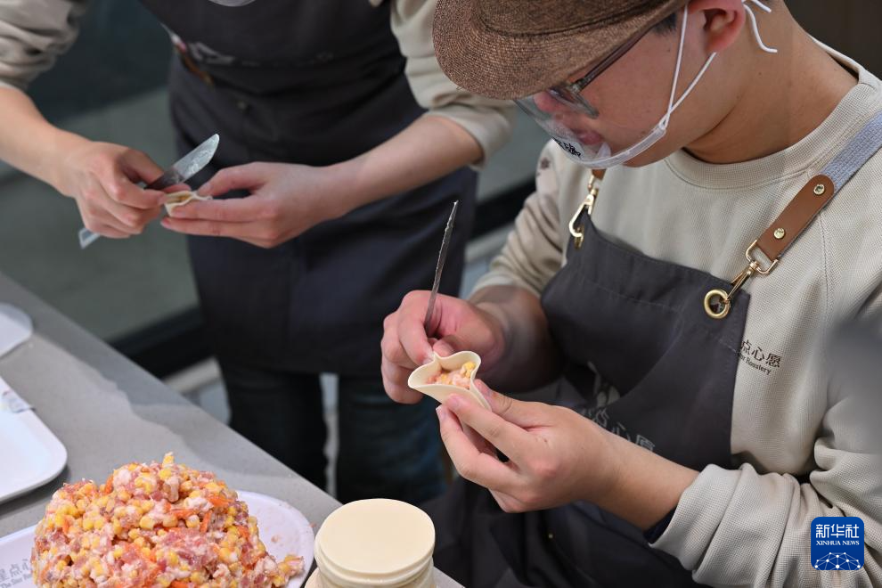 4月2日,在“星点心愿”——支持孤独症青年工作公益店内,“星青年”在辅导老师的示范下学习包饺子。