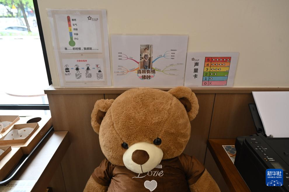 “星点心愿”——支持孤独症青年工作公益店内放置的用于安抚“星青年”情绪的小熊玩偶(4月1日摄)。
