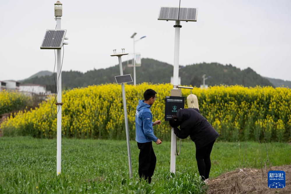 4月1日,在中江县酿酒专用小麦基地,中化农业MAP中江技术服务中心工作人员向云(左)、张蔚检查靶标害虫自动测报系统的运行情况。这些智能监测数据可以实时反映在后台,为种植户提供及时的预警和农事建议,打通了数字到田的“最后一公里”。