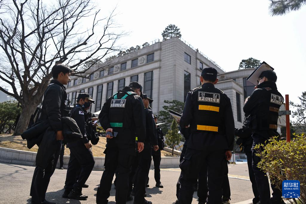 4月3日,在韩国首尔,警察在韩国宪法法院前执勤。
