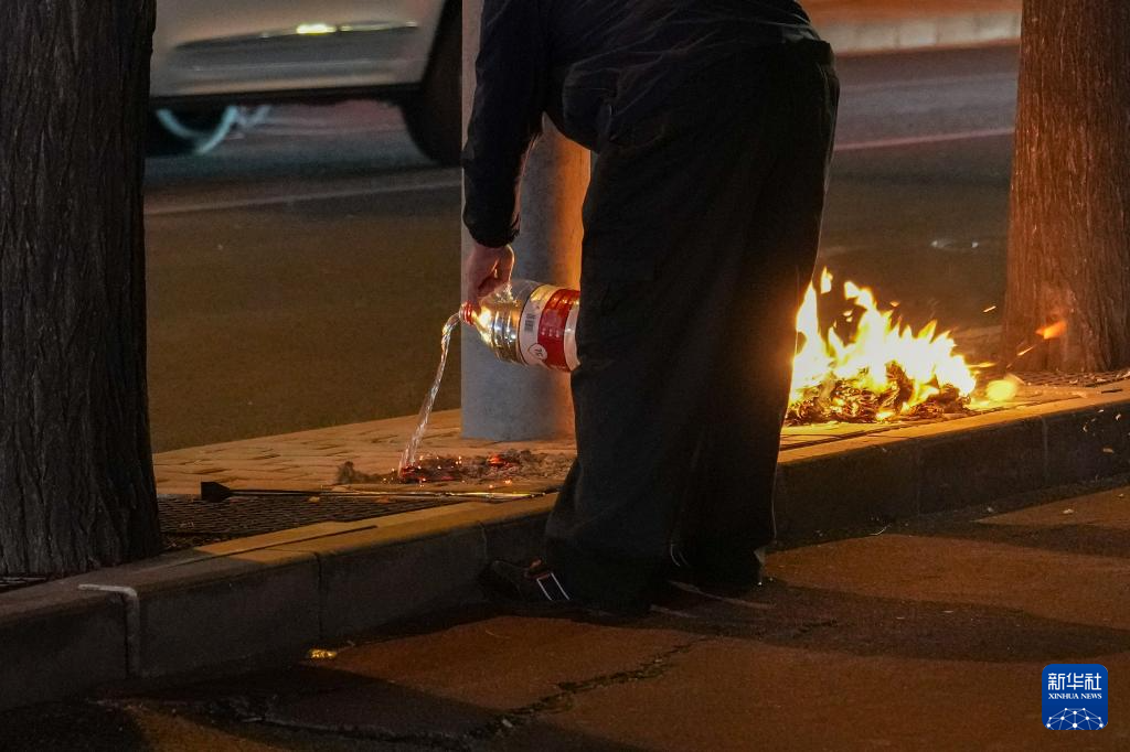 4月1日,在北京某处路口,市民焚烧纸钱祭奠逝者后,用水浇灭余烬。