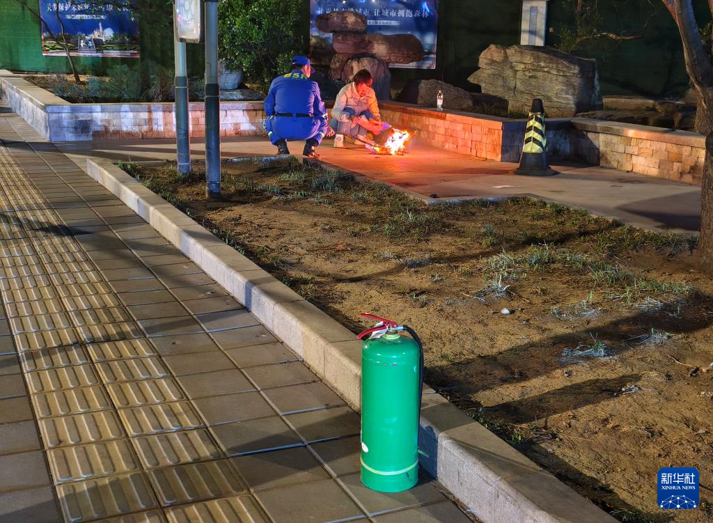 3月31日,在北京街头某处,市民焚烧纸钱,保安根据社区和相关部门安排手持水桶值守。