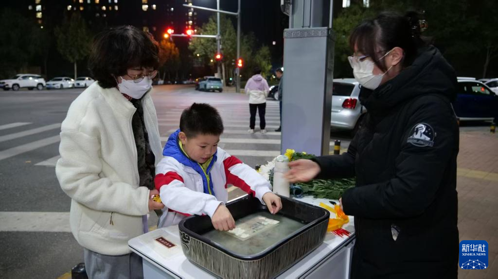 4月2日,在北京市瀛海镇一处交叉路口,瀛海镇文明祭扫工作人员为前来进行“水溶润祀”的群众提供指导。近年来,北京亦庄新城瀛海镇为镇域居民免费提供时空驿站、鲜花祭奠、水溶润祀和丝带祈福4项新式祭扫服务。