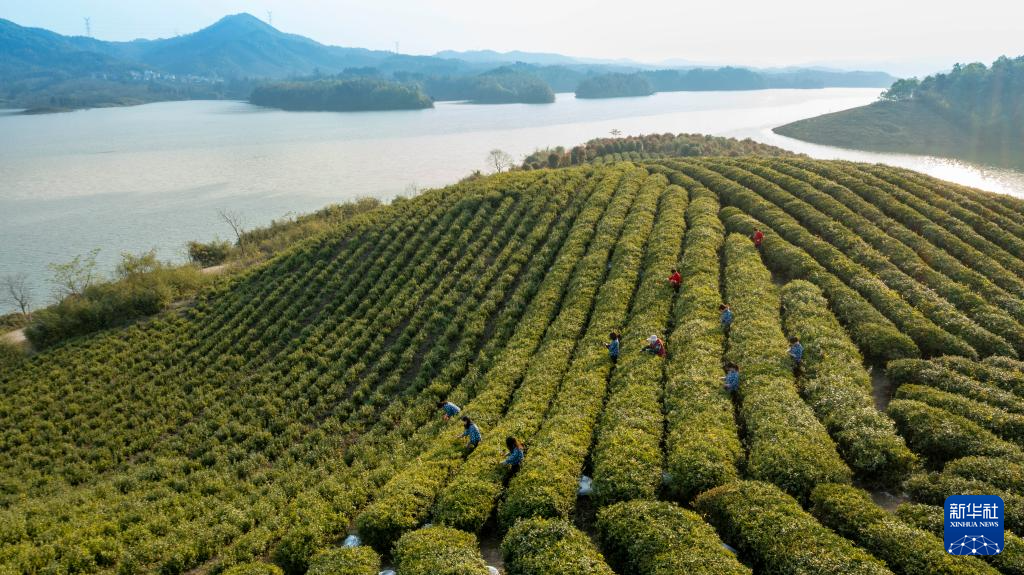 4月2日,在安徽省宣城市郎溪县建平镇精忠村的一处茶园,茶农们在采摘茶叶(无人机照片)。