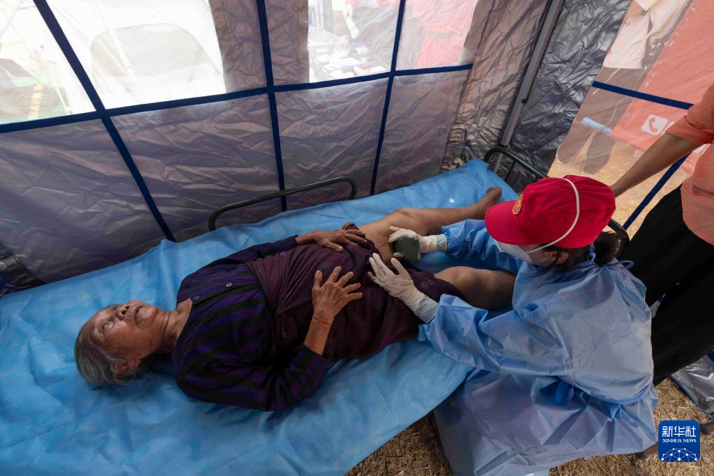 4月3日,在缅甸曼德勒医学院附近的一处安置点,中国救援队队员为一女子检查关节损伤情况。