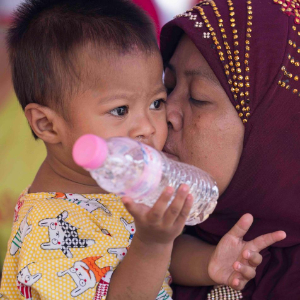 4月3日,在缅甸曼德勒医学院附近的一处安置点,一名女子带着孩子就诊。