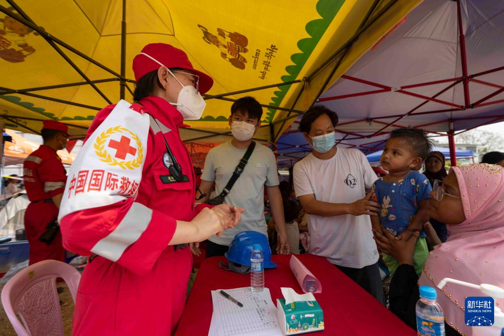 当日,在缅甸曼德勒医学院附近的一处安置点,中国救援队伍开展义诊,为该安置点的千余名灾民提供诊疗服务。