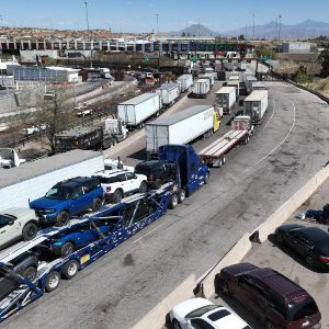 4月2日,在墨西哥索诺拉州诺加莱斯市,一辆装载多辆汽车的运输车(下中)行驶在墨美边境附近的公路上(无人机拍摄)。