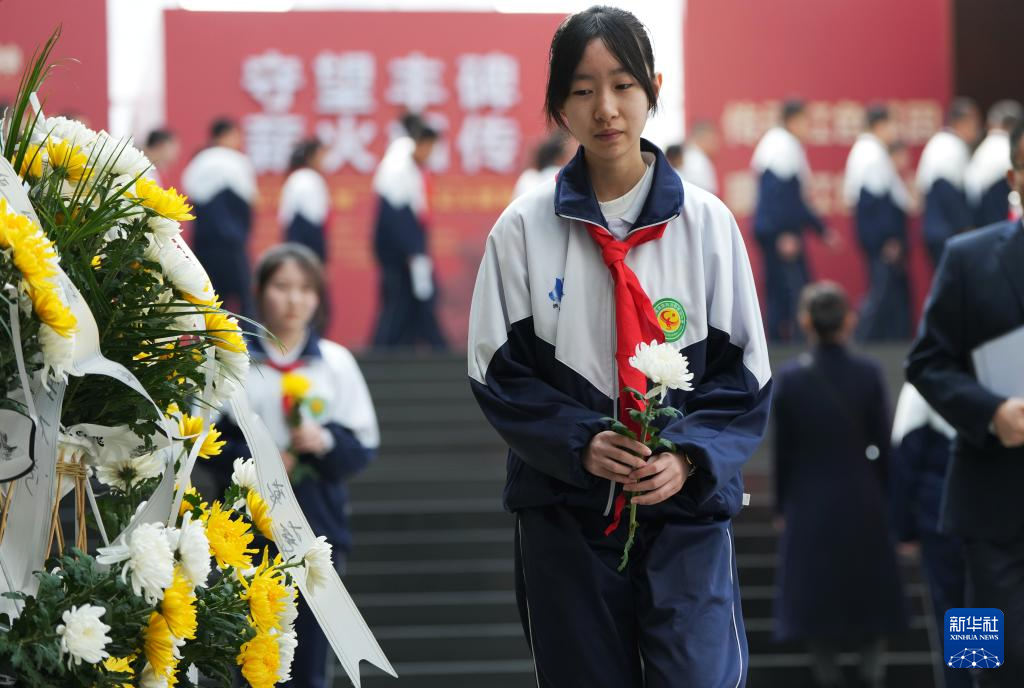 4月3日,抗联中学学生在东北抗联史实陈列馆给英烈献花。
