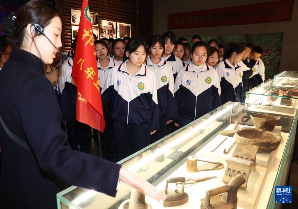 4月3日,抗联中学学生在东北抗联史实陈列馆参观。