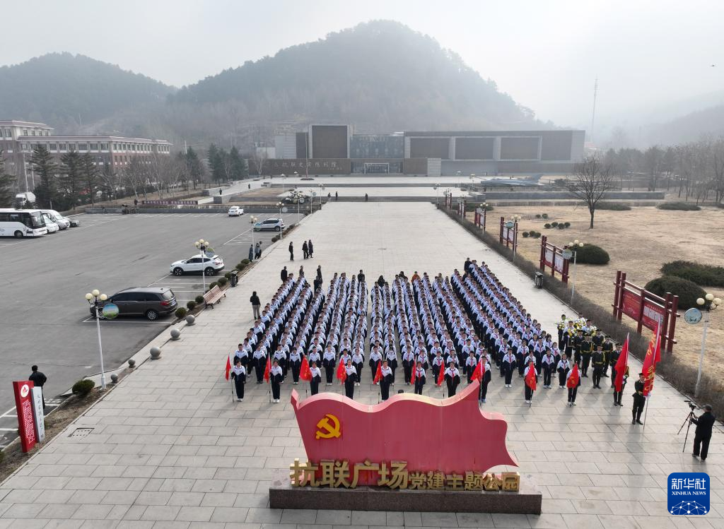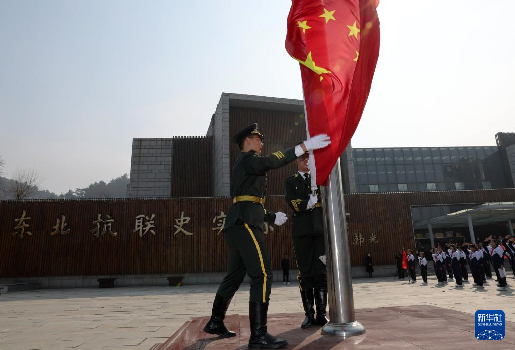 4月3日,抗联中学学生在东北抗联史实陈列馆门前举行升旗仪式。