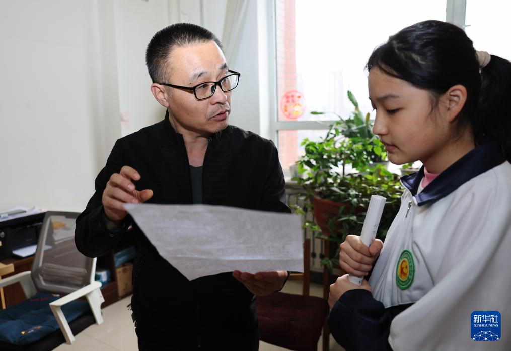 抗联中学团委书记王浩(左)指导参加抗联英雄故事演讲的学生(4月2日摄)。