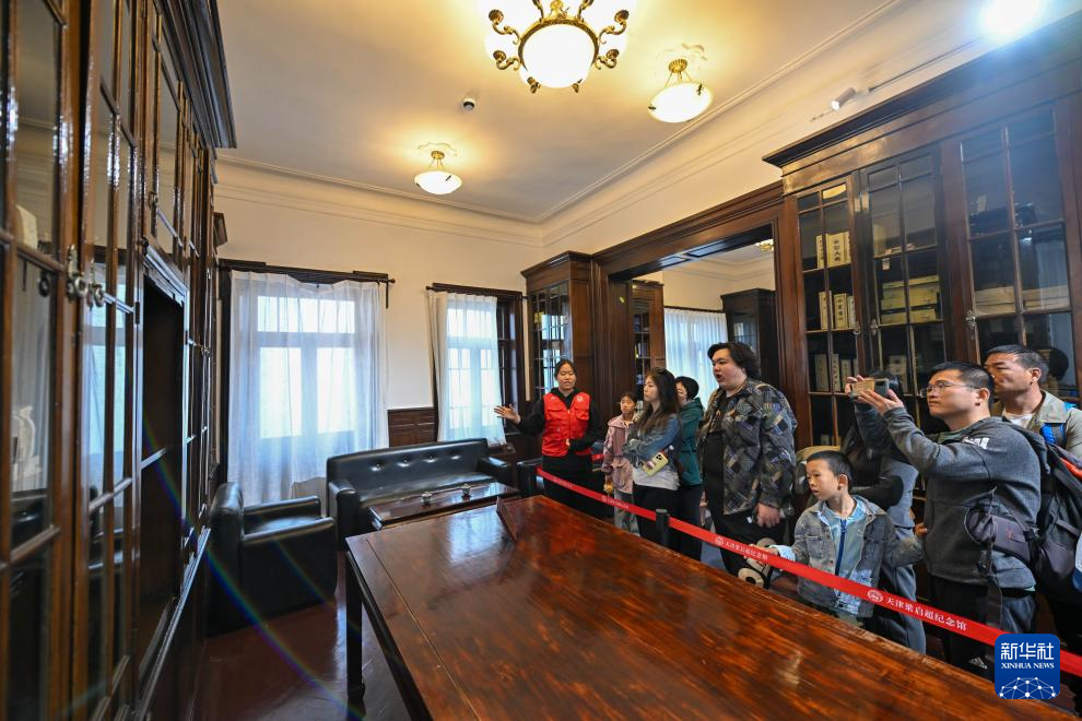 4月4日,讲解员在天津梁启超纪念馆“饮冰室”书斋内为游客提供免费讲解服务。