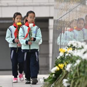 4月4日,在山东省济南市,小学生在济南革命烈士陵园向烈士献花。