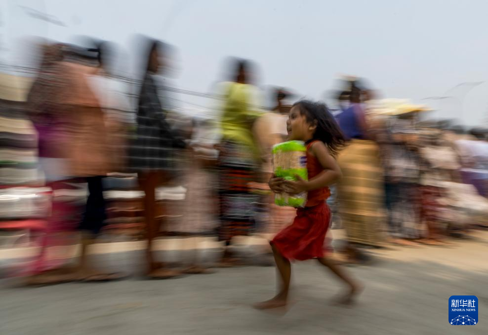 4月4日,在缅甸曼德勒皇宫附近的一处安置点,一名儿童领取食物和饮用水。