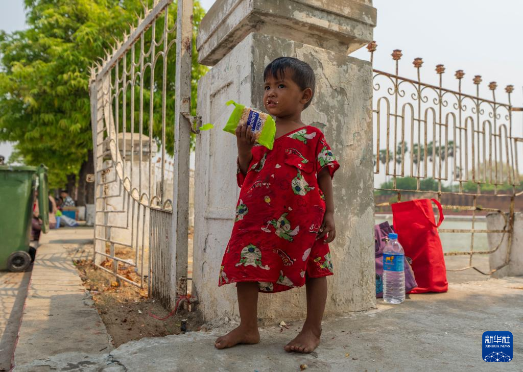4月4日,在缅甸曼德勒皇宫附近的一处安置点,一名儿童吃着领取的食品。