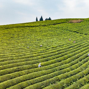 4月4日,茶农在贵州省安顺市西秀区双堡镇山京茶场采茶(无人机照片)。