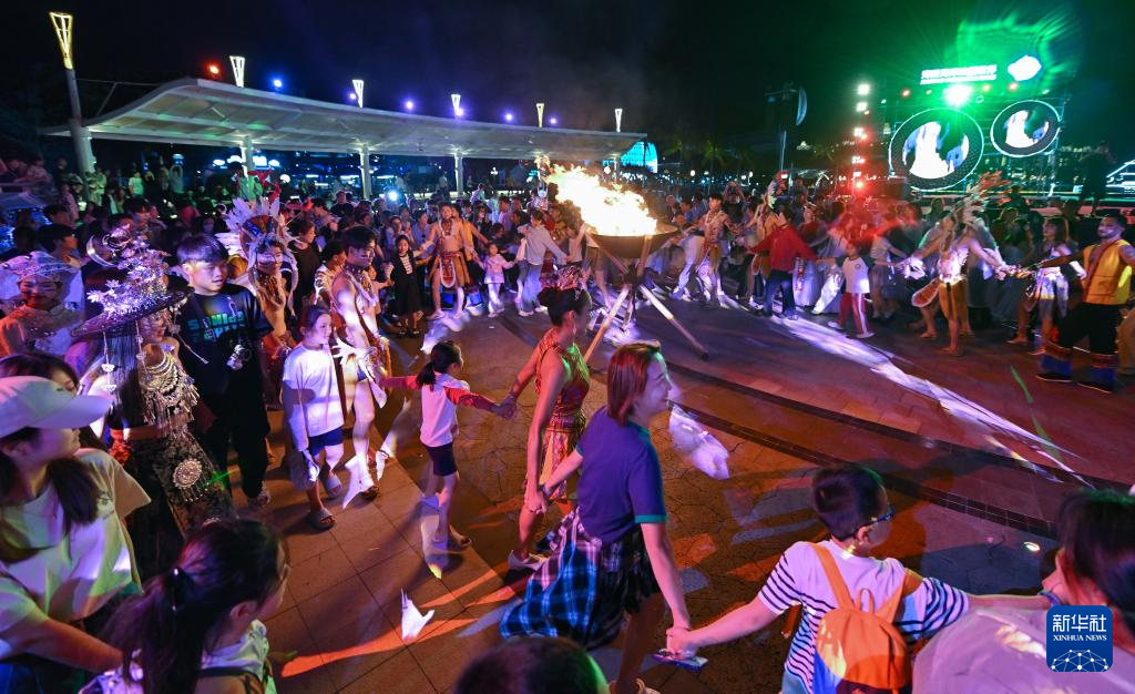 4月4日,游客和演员在海南海洋欢乐世界度假区围绕篝火跳舞。
