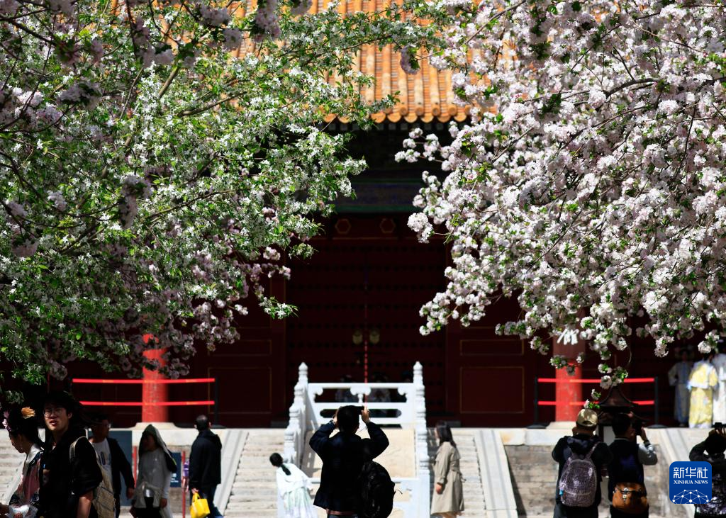4月5日,游客在北京故宫熙和门前拍照留影。