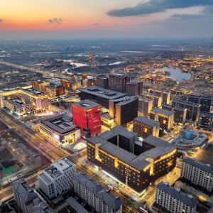 雄安商务服务中心夜景(3月15日摄,无人机照片)。雄安商务服务中心是雄安新区首个标志性城市建筑群,其朱红墙体、灰色飞檐的建筑彰显中式特色。