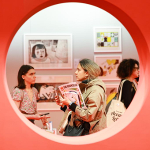 4月1日,在意大利博洛尼亚,人们在第62届博洛尼亚国际儿童书展中国插画展区参观。