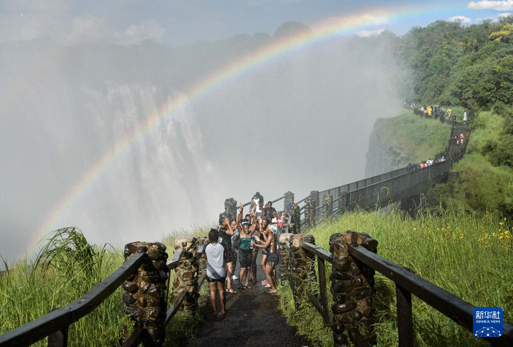 3月29日,游客在维多利亚瀑布赞比亚一侧参观游览。