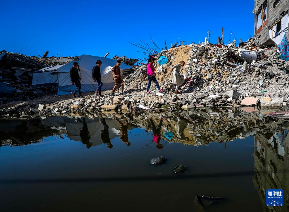3月31日,在加沙地带北部的杰巴利耶难民营,巴勒斯坦儿童经过一片建筑废墟。