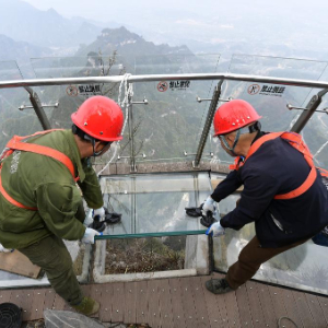 4月8日,施工人员更换玻璃栈道的玻璃。