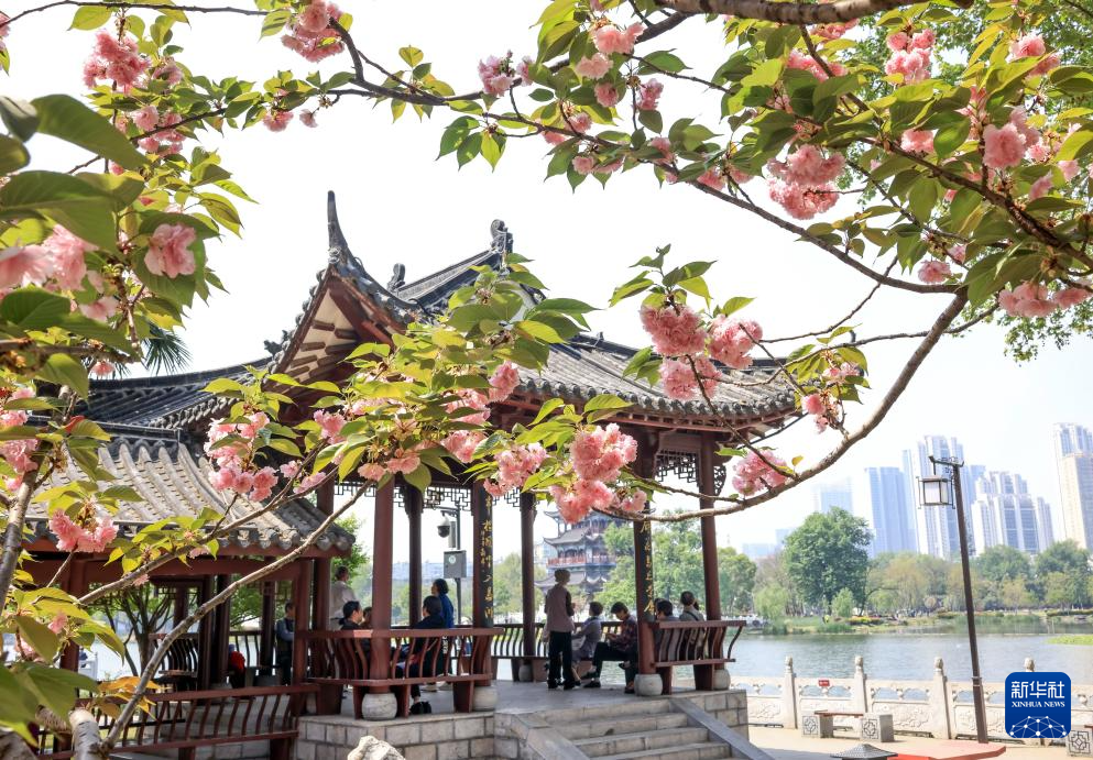 4月6日,游人在河南省开封市禹王台公园观赏盛开的樱花。