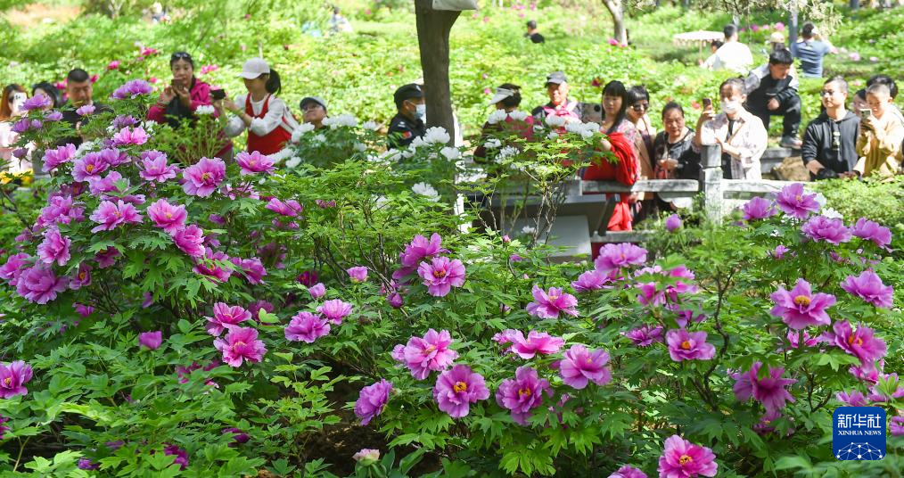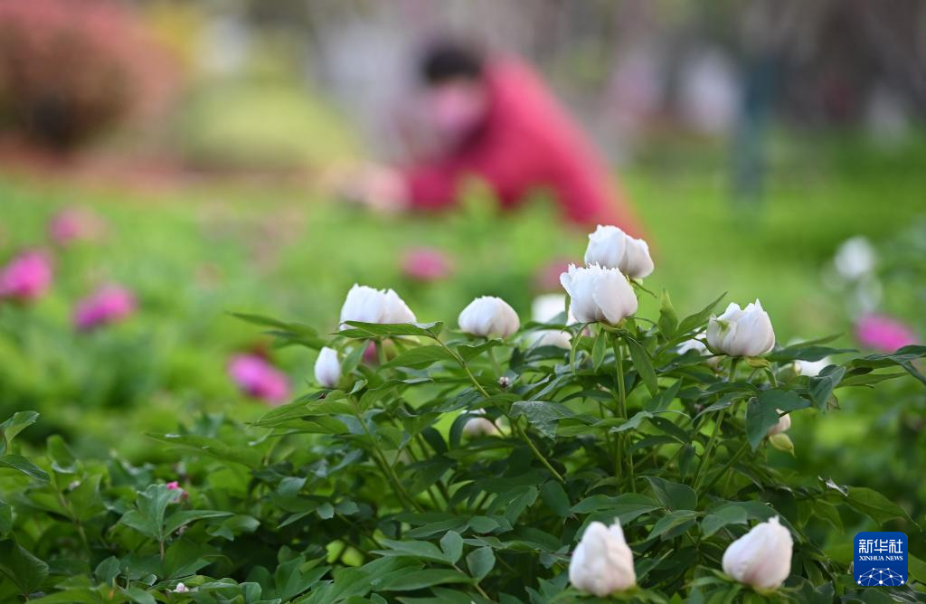 4月8日,游客在山东省滕州市荆河公园的牡丹园内赏花拍照。