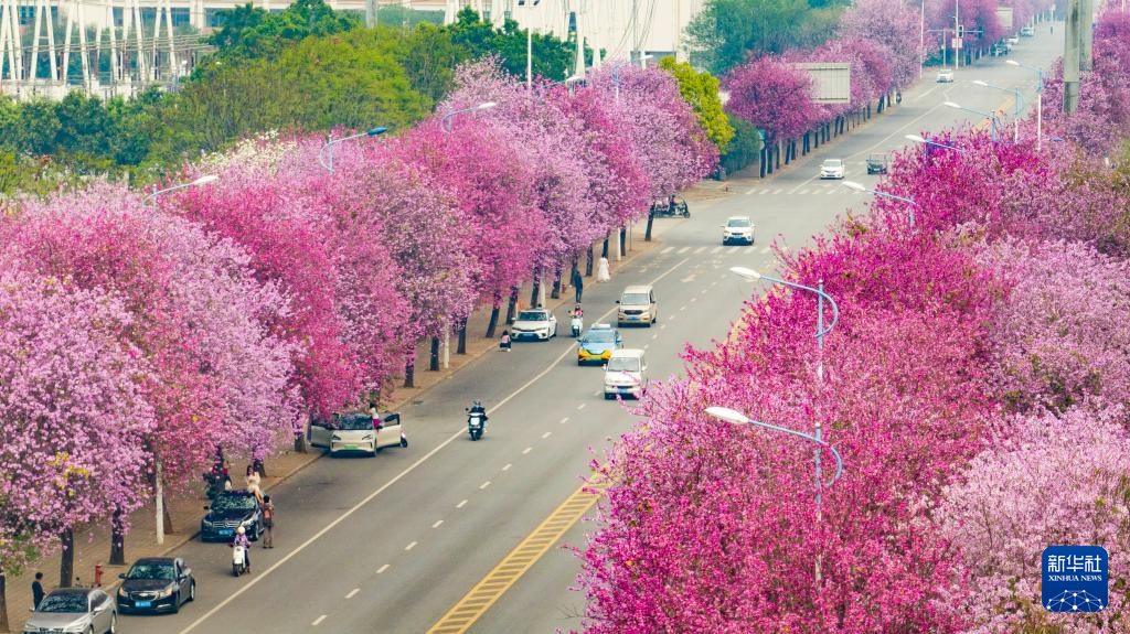 4月6日,游客在广西柳州市葡萄山路赏花拍照(无人机照片)。