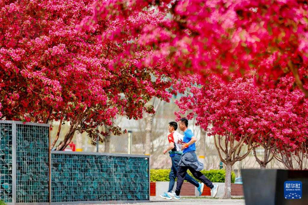4月8日,跑步爱好者在天津市滨海新区的金海湖公园内沿花间小道奔跑。