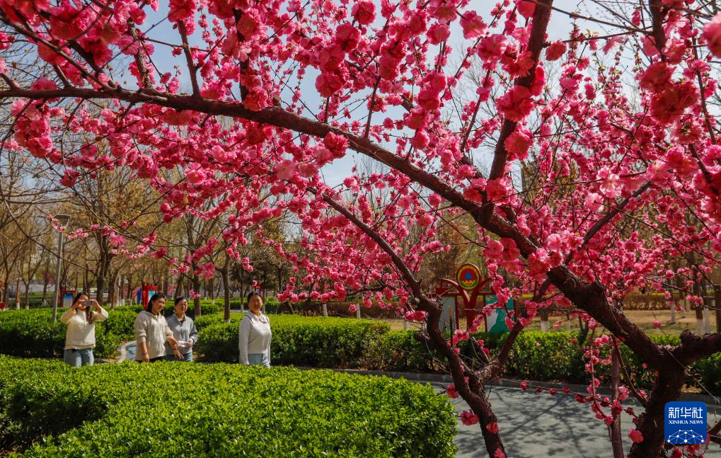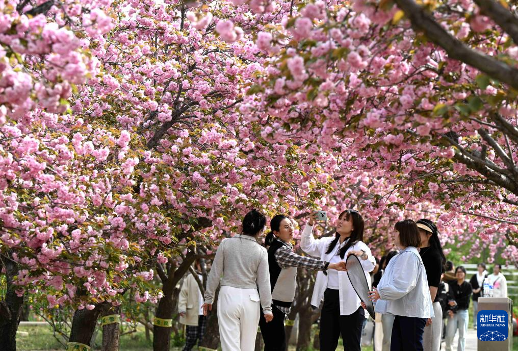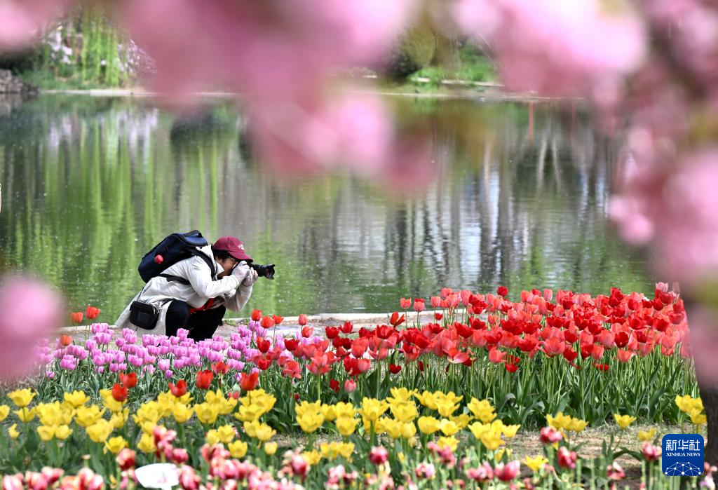 4月8日,游客在河北省石家庄市植物园赏花游玩。