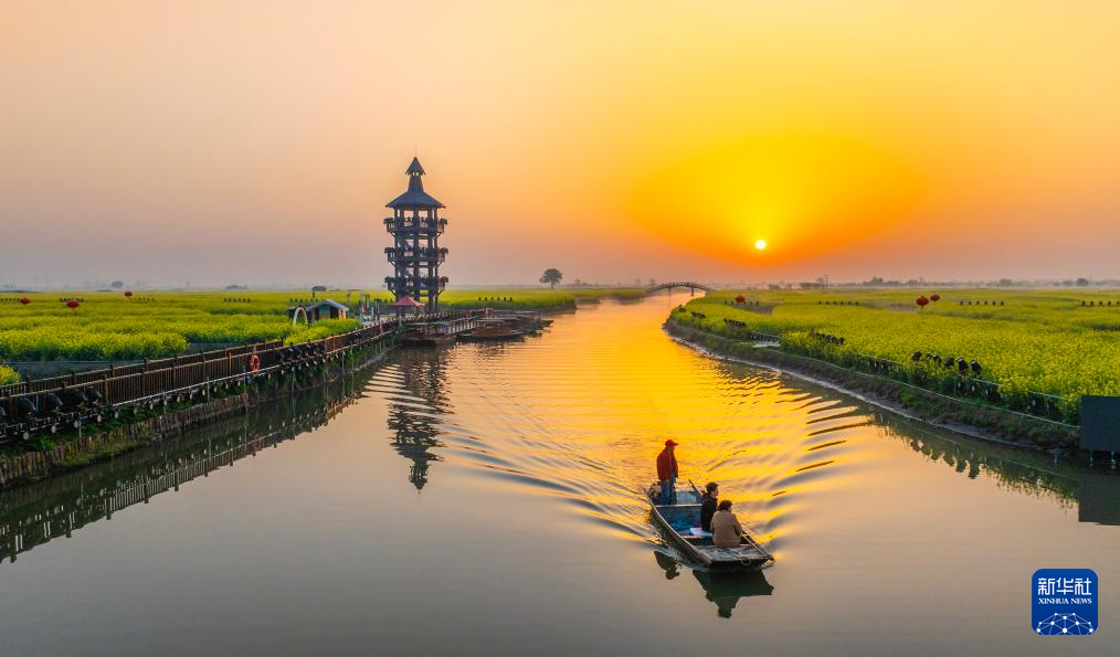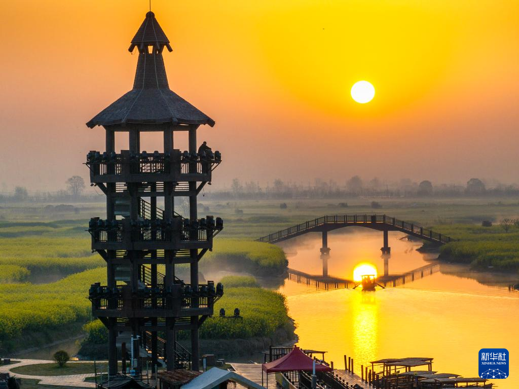 4月8日拍摄的江苏省兴化市千垛景区日出晨景(无人机照片)。