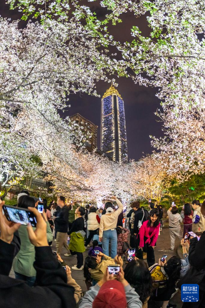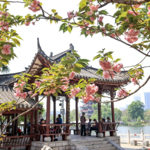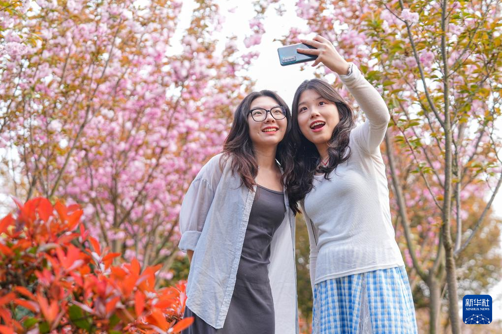 4月7日,浙江省温州市区马鞍池公园内的樱花绚烂绽放,吸引不少市民前来观赏、打卡拍照。