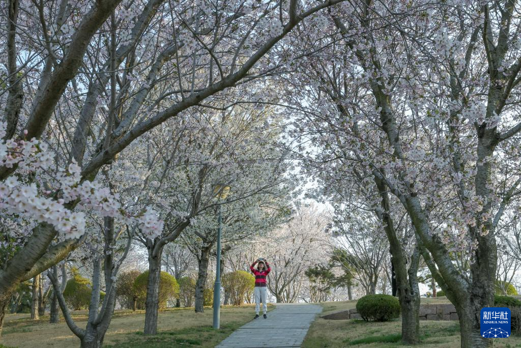 4月8日,市民在山东省荣成市樱花湖体育公园樱花大道观赏樱花。