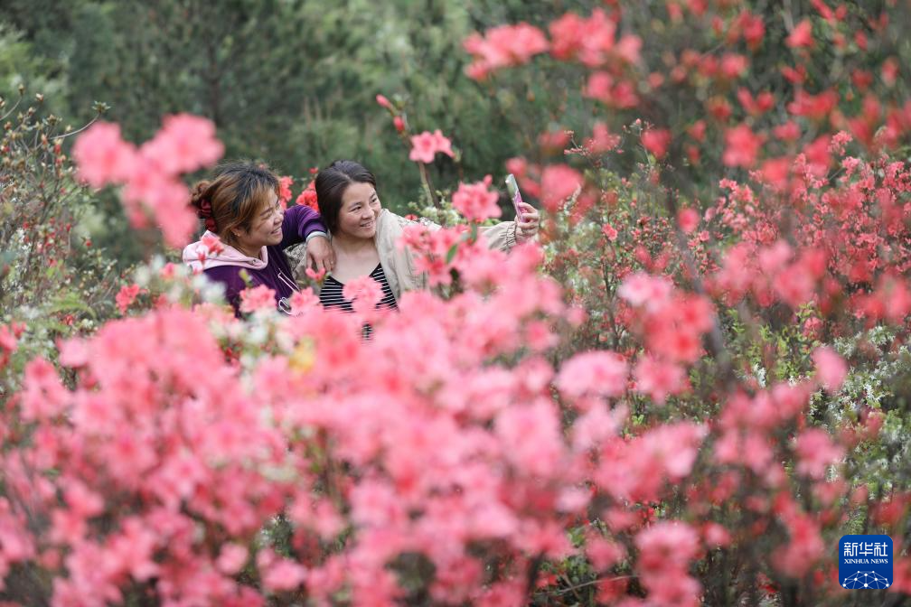 4月8日,游人在湖南省永州市道县宜山岭野生杜鹃花丛里赏花拍照。