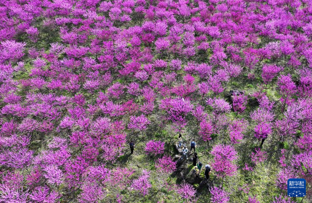 4月8日,游客在河北省遵化市南山常乐谷景区踏青赏花。